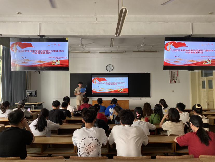 认真落实“三会一课”制度,采用主题党日、党课等形式,学习贯彻习近平总书记在中共中央政治局第五次集体学习时重要讲话精神,教育引导全体毕业生党员坚持以习近平新时代中国特色社会主义思想为指导,进一步增强“四个意识”、坚定“四个自信”、做到“两个维护”,自觉按照党员标准规范言行,迈好走向新岗位的第一步。