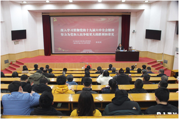 李洪洲以“深入学习贯彻党的十九届六中全会精神 努力为党和人民争取更大的胜利和荣光 ”为题,结合丰富的史实、翔实的数据,从“十九届六中全会最重要的成果”“党的百年奋斗的初心使命和重大成就”“中国特色社会主义新时代的历史性成就和历史性变革”“党的百年奋斗的历史意义和历史经验”“新时代的中国共产党”“党的百年奋斗历程中汲取的智慧和力量”六个方面对全会内容进行了深入解读。他表示,这次全会是在我们党成立一百年的重要历史时刻,在党和人民胜利实现第一个百年奋斗目标、全面建成小康社会,正在向着全面建成社会主义现代化强国的第二个百年奋斗目标迈进的重大历史关头召开的,全会通过的《中共中央关于党的百年奋斗重大成就和历史经验的决议》 是一篇马克思主义的纲领性文献,必将对推动全党统一思想、统一意志、统一行动,团结带领全国各族人民以史为鉴、开创未来,埋头苦干、勇毅前行,在新时代更好坚持和发展中国特色社会主义、实现中华民族伟大复兴产生重大而深远的影响。