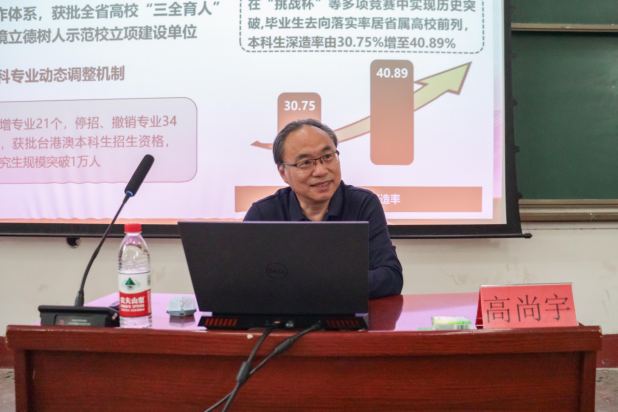 会上,高尚宇重点围绕学校第四次党代会基本情况、重要意义和主要成果、主要精神以及推动学校第四次党代会精神落实见效四个方面进行了全面阐释。他强调,学校第四次党代会系统擘画了学校高质量跨越式发展战略布局,明确了“一三六八十”的战略目标,全体师生要以战略思维谋全局,以改革精神破难题,以奋斗姿态抓落实,确保球探网足球 发展与学校战略同频共振。结合学校第四次党代会对新时代青年的要求,高尚宇向参会人员提出三点希望:一是要胸怀家国,志存高远,将个人理想融入国家发展大局。二是要勤学善思,锤炼本领,以扎实的专业知识支撑未来职业发展。三是要知行合一,勇于担当,在实践中增长才干,为球探网足球 和学校的高质量发展贡献青春力量。
