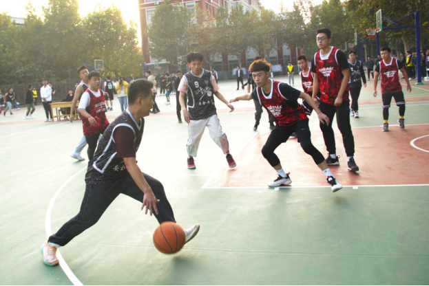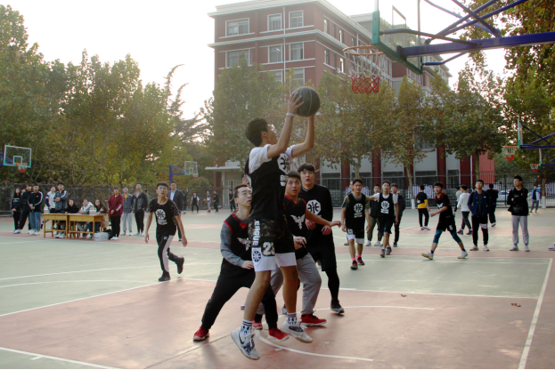 班级篮球赛半决赛在篮球场顺利举行。