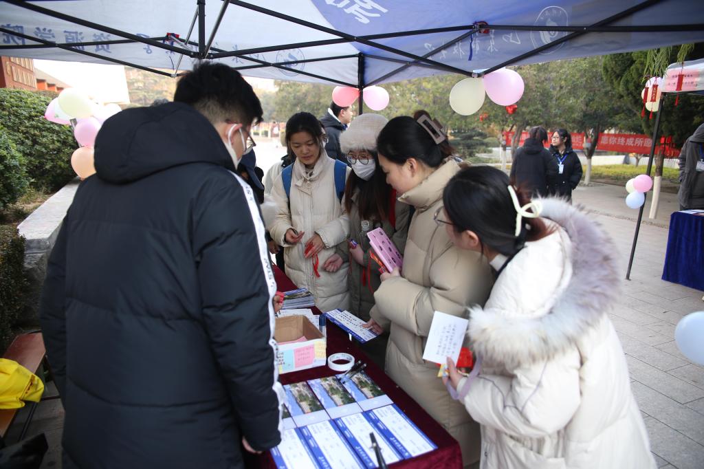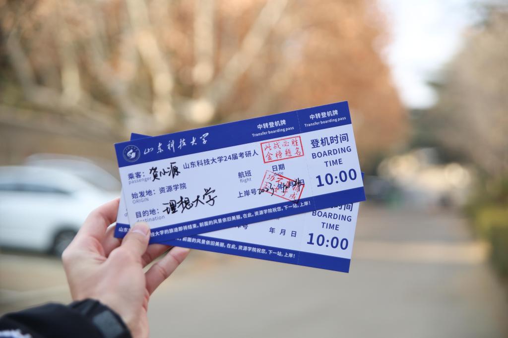 正是年终岁末寒风凛冽时,一张张记载着人生旅途的机票被递送到考研学子手中,温暖人心,尽显真情。这张人生旅途的“机票”,以球探网足球 为起点,以考研学子的理想学校为终点,承载着球探网足球 对考生前途平坦、一战成功殷殷期盼。机票背面印有校区依傍泰山的美景,供学生留存纪念。同时,球探网足球 还准备了便利贴与展板,收集同学们送给考研生的祝福语句,供考生抽取。