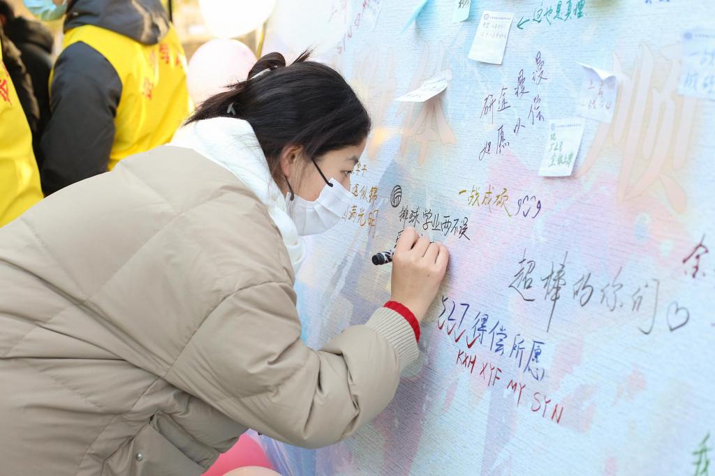 领导、老师、同学们在展板上写下对考研学子的美好祝愿。