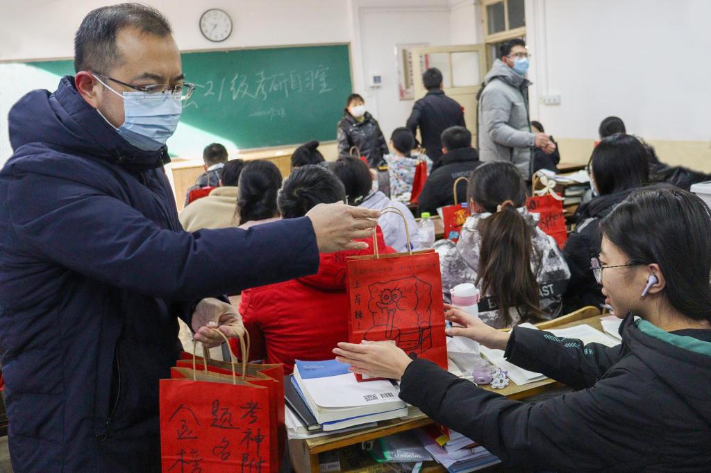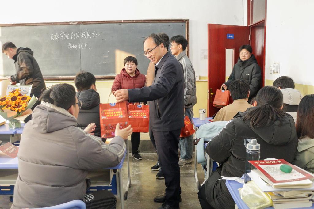 领导和老师们手提福袋,轻轻走进考研自习室,将这份沉甸甸的心意送到学子们手中,为考研学子送去暖心关怀。防灾减灾科学与工程2021级1班范丙珂说:“我大一的时候也曾经亲手做过福袋送给学长学姐,现在又收到了来自学弟学妹的祝福。这不仅仅是一个福袋,更是球探网足球
