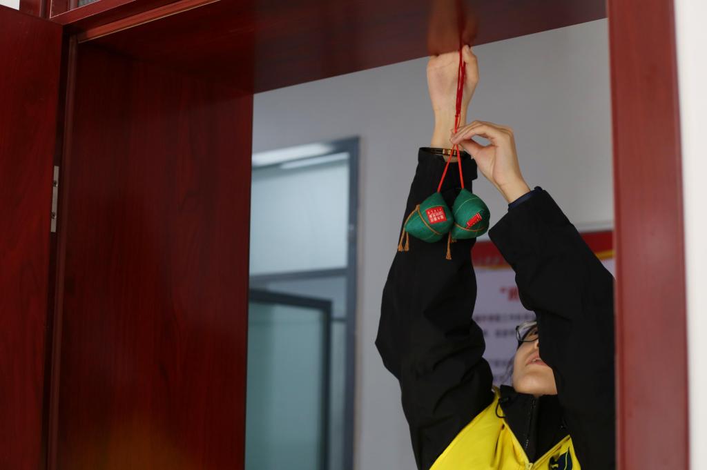 组织志愿者将粽子形状的香包逐一悬挂在考研自习室门框上方,寓意“一举高粽”。同时,志愿者在每位考生书桌上摆放“高粽”挂件,放置“高粽”胸针,祝愿他们能够在考研之路一帆风顺,勇夺桂冠。