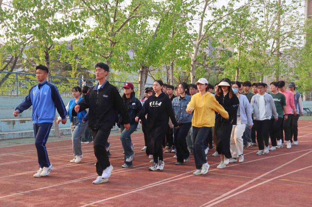 学工办主任、团委书记洒艳及部分辅导员到操场指导运动会开幕式方队训练。