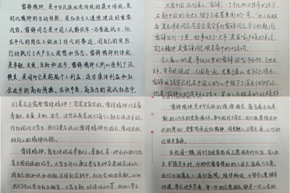 学生积极响应,重点围绕雷锋精神的时代内涵、身边的“雷锋式”榜样、自身践行雷锋精神的感悟等主题,以真挚笔触,讲述校园中志愿者不辞辛劳服务师生的暖心故事,描绘社区里孤寡老人受助后展露的笑颜,探讨新时代如何传承雷锋的“钉子精神”于学业钻研之中。一篇篇征文,或激昂、或质朴,字里行间满是对雷锋精神的敬仰,这些作品展现了较高写作水准,同时凸显了同学们对雷锋精神深刻理解,从理论认知延伸至生活点滴践行。最终,评出一等奖一名,二等奖两名,三等奖三名。