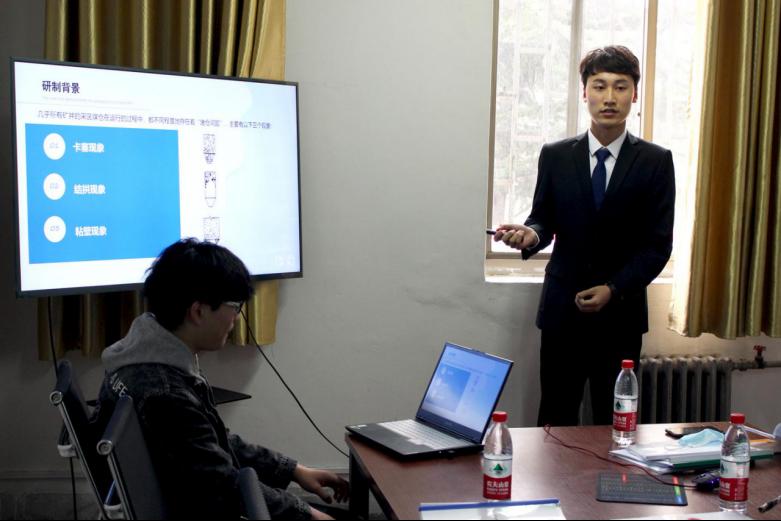 319球探网足球 组织入围挑战杯”决赛的5队伍3#307进行模拟答辩。智能装备球探网足球 老师李东民球探网足球 团委辅导员尹发利出席到模拟答辩现场,为参赛队伍提出建议,指改进方向。