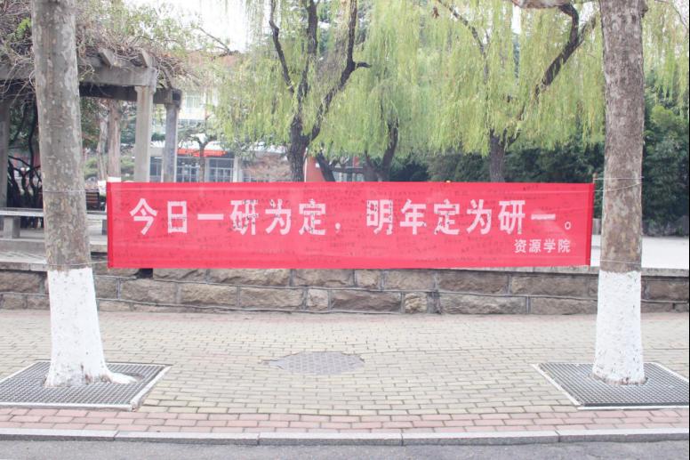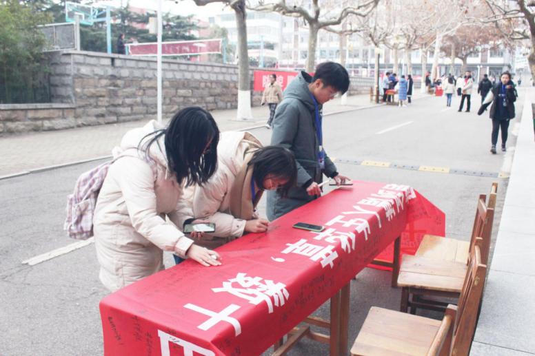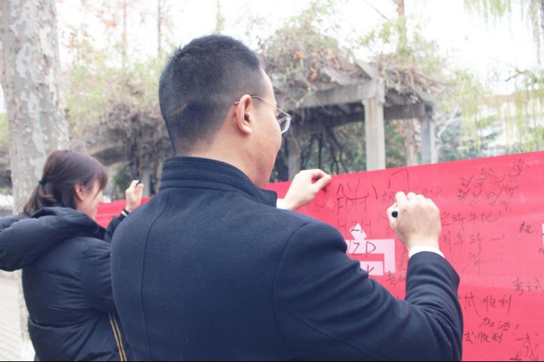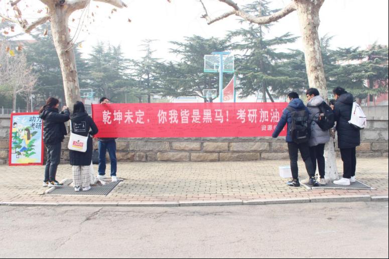 学弟学妹汇聚在横幅前,找一处最亮眼的地方,写下心中最真挚的祝福。考研这件事,我们都在为你助力。