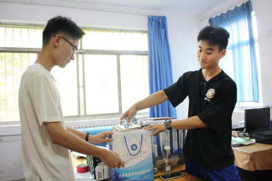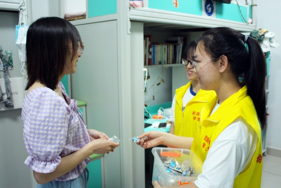 “学姐,请查收您的毕业礼物。”学生会成员走入毕业生宿舍,为他们送上精美钥匙扣。