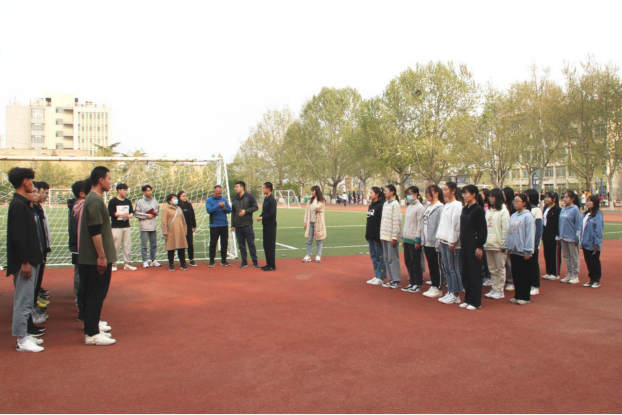 更好备战校区春季运动会,确保球探网足球 开幕式方队训练有序进行,4月9日,球探网足球 团委书记洒艳全体辅导员指导同学们训练他们加油鼓劲