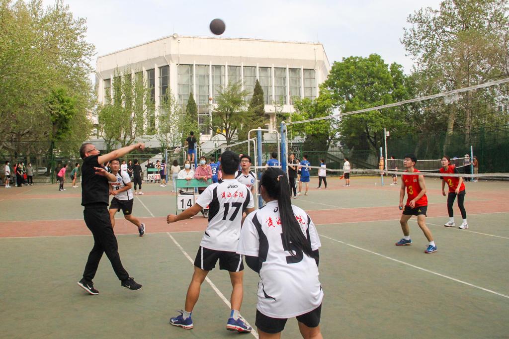 在首日比赛中,洒艳队与张运忠队的对决尤为激烈。比赛开始后,洒艳队迅速进入比赛状态,多次拦住三号位半高球、短平快球;张运忠队选手们不甘落后,凭借精彩的救球与犀利的扣球紧咬比分,将比赛推入白热化阶段。最终,洒艳队越战越勇,灵活运用吊球技术连续得分,赢得比赛胜利。其他场地上,参赛师生紧密配合,长传、扣杀、垫球……队伍之间你追我赶,精彩场面频频出现,场下喝彩助威声不绝于耳。经过激烈的角逐,洒艳、张裴、牛会功老师队赢得首日比赛胜利。