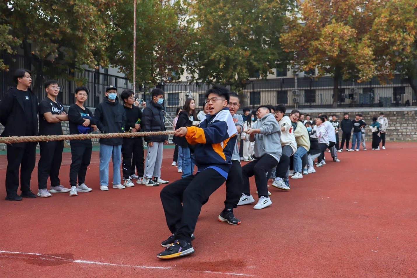 11月13日,紧张焦灼的比赛氛围再次点燃了同学们的热情。其中,以工程管理2020级6班和工程管理2021级6班的四强晋级赛最为精彩。随着一声哨响,工程管理2020级6班参赛队员紧紧地握住麻绳,他们个个咬着牙,身子向后倾,一鼓作气,以力量优势赢得了第一局比赛的胜利;工程管理2021级6班参赛选手改变策略,调整靠绳位置与姿势,消耗对手体力,赢得第二局比赛胜利;在最后一局中,红布条在中间线上左右晃动,比赛场面激烈异常,工程管理2020级6班参赛队员双手紧握绳子,咬紧牙关,奋力拉扯,拼搏到底,最终赢得了比赛的胜利。