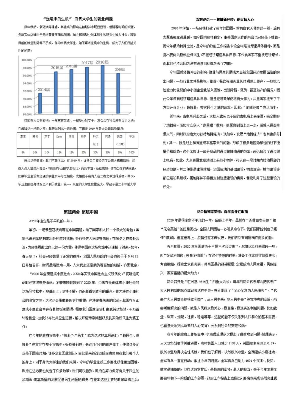 今年是全面建成小康社会的收官之年,亦是“两个一百年”奋斗目标与脱贫攻坚冲刺的交汇之年,目前又是新冠肺炎疫情防控形势持续向好、经济社会运行持续趋于正常的重要时期,此次两会的召开,背景特殊、意义重大。球探网足球 学子期间持续关注两会动态,深刻思考两会议题,积极参与征文投稿,畅谈自己的学习心得体会,围绕民生保障、就业创业、经济发展、疫情防控、脱贫攻坚等两会热点话题各抒己见,结合时代背景对两会精神内核与当代青年的使命担当进行深度思考,言辞真切、实事求是,其中涌现出大量优秀作品。