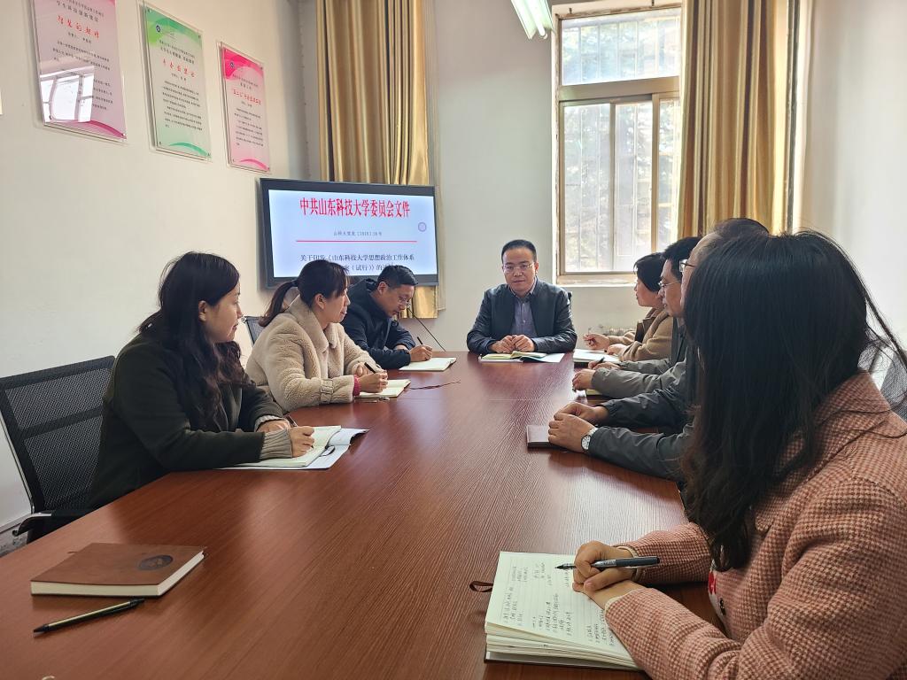 会议上,程家国带领全体辅导员学习了《山东科技大学思想政治工作体系总体方案(试行)》文件精神,要求辅导员们坚持育人为本、德育为先,坚持目标导向、制度保障等四大基本原则,构造课堂教学、网络思政等六大功能平台,将思想政治工作融入人才培养各环节,构建一体化育人体系。全体辅导员老师对学校思想政治工作体系总体方案进行交流与学习,明确了自己坚持以立德树人为根本任务,以提高人才培养能力为关键的工作内容与职责,并对构建“三全育人”新格局有了更深的了解与思考。