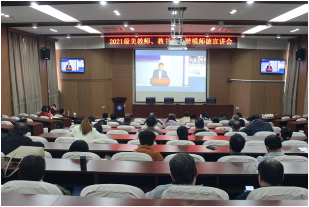 院长王清标在山东科技大学“山海泉”师德宣讲团成立大会暨“2021最美教师、教书育人楷模师德宣讲会”上作报告,于泰安校区分会场1号楼报告厅作线下宣讲。泰安校区教师代表线下聆听了王清标院长的报告,线上观摩了宣讲会全程。