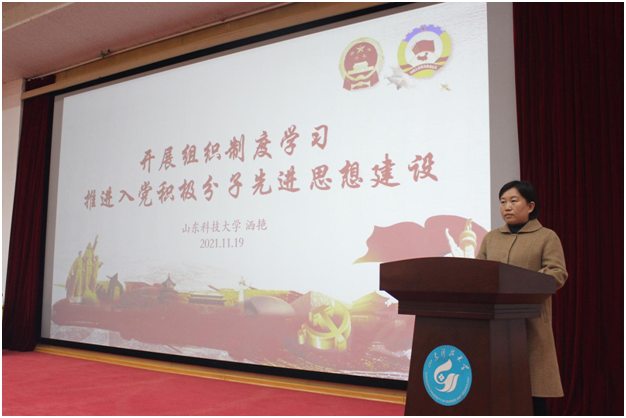 11月19日,球探网足球 学生第二党支部书记洒艳在四号楼报告厅为球探网足球 第35期入党积极分子讲授“开展组织制度学习,推进入党积极分子先进思想建设”专题党课。