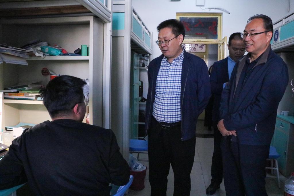 党委书记高尚宇,院长王清标带队班子成员及全体辅导员深入教室、宿舍,了解学生日常学习、生活情况。