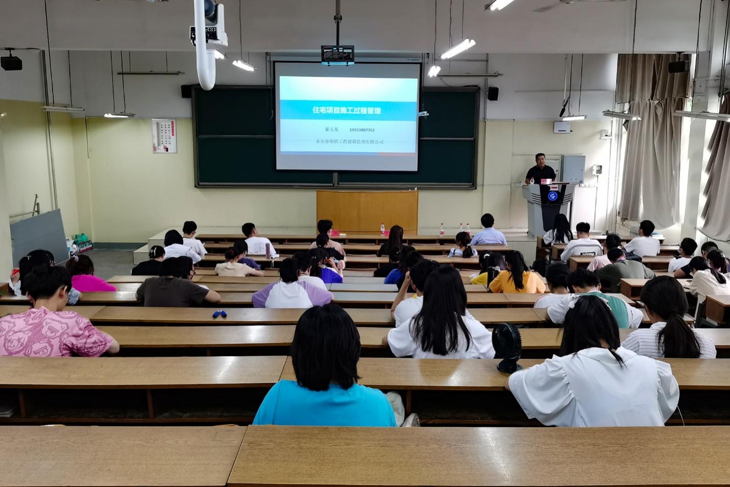 素质培养、未来市场趋势、职业资格要求和工作经验五个方面出发,为学生们讲解了工程管理专业未来的职业发展前景。随后,他结合自身工作经验,详细地讲述了在住宅项目施工过程中的管理办法。他强调,工程建设是一个庞大且精密的工作,要做到精心规划,精研方案,精细管理。