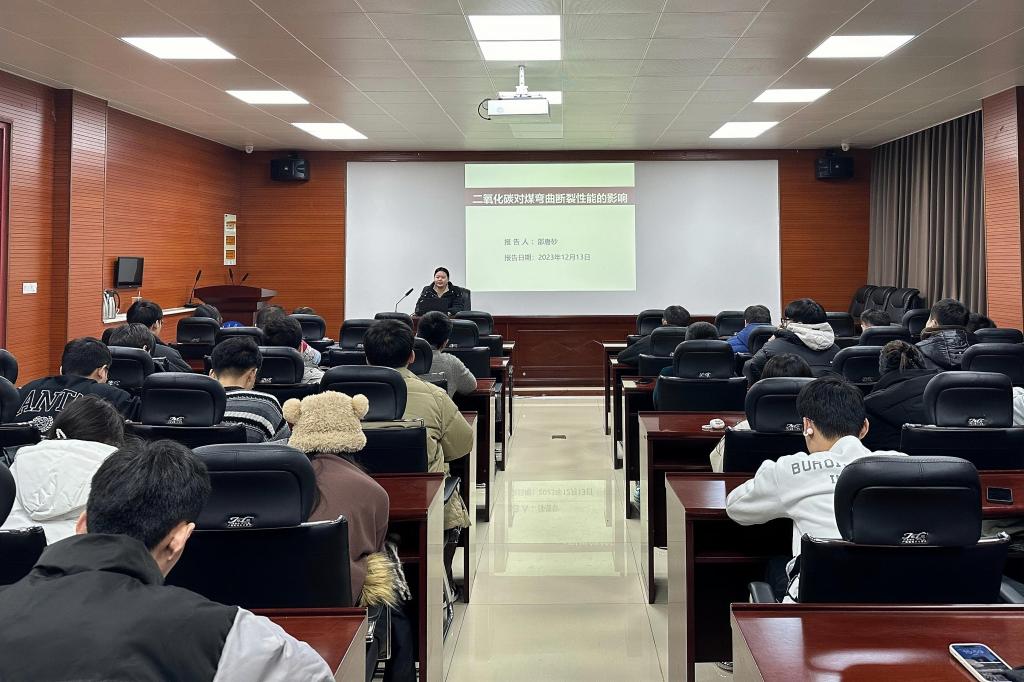 教师邵唐砂在东校园2号楼201会议室为研究生作“二氧化碳对煤弯曲断裂性能的影响研究”学术报告。